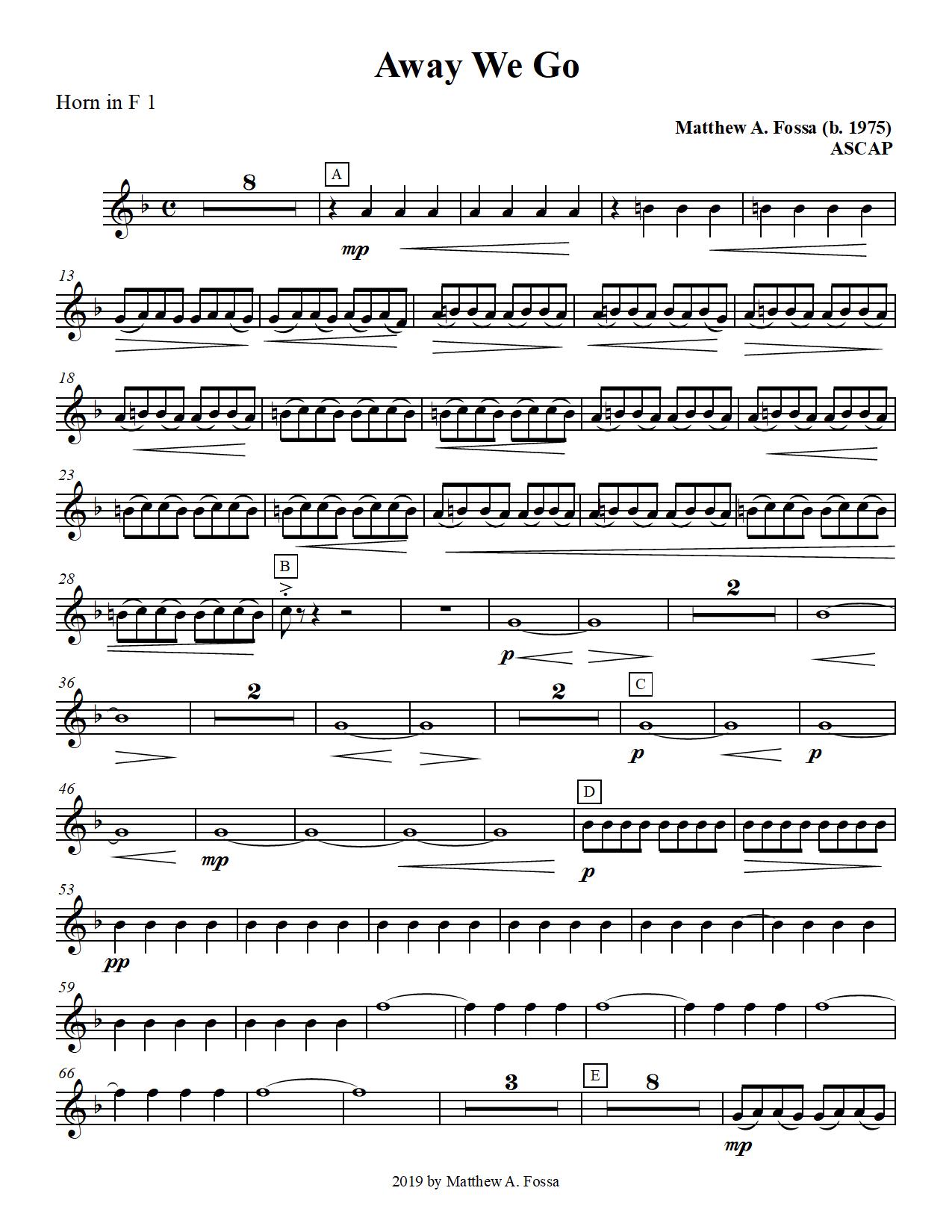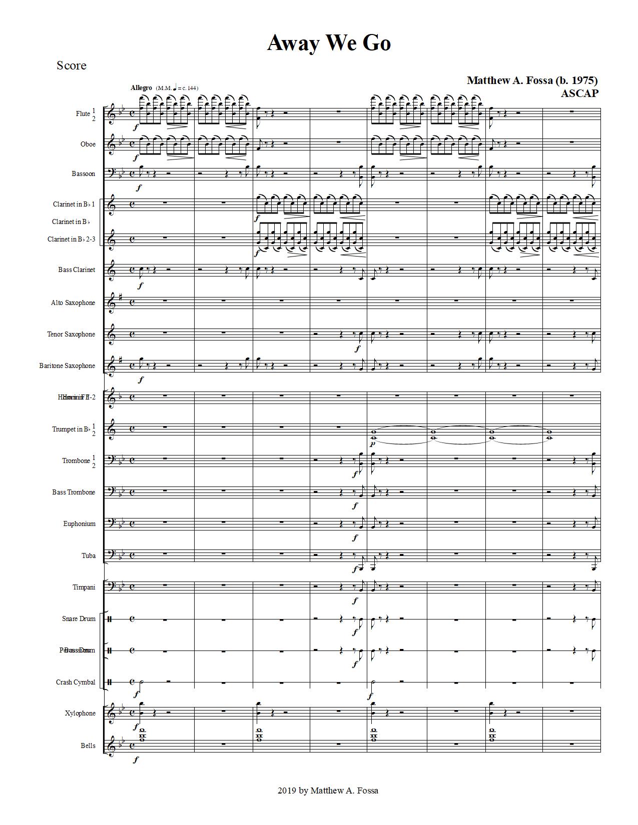 "Away We Go," is very much an homage to the music of John Adams... particularly, "Short Ride," and "Tromba Lontana," his two orchestral fanfares. Anyone who is familiar with Adams' work will definitely hear the influence in my writing. Hopefully, any band director who introduces my piece to their band will take a moment and explain about Adams and his post-minimalist style.