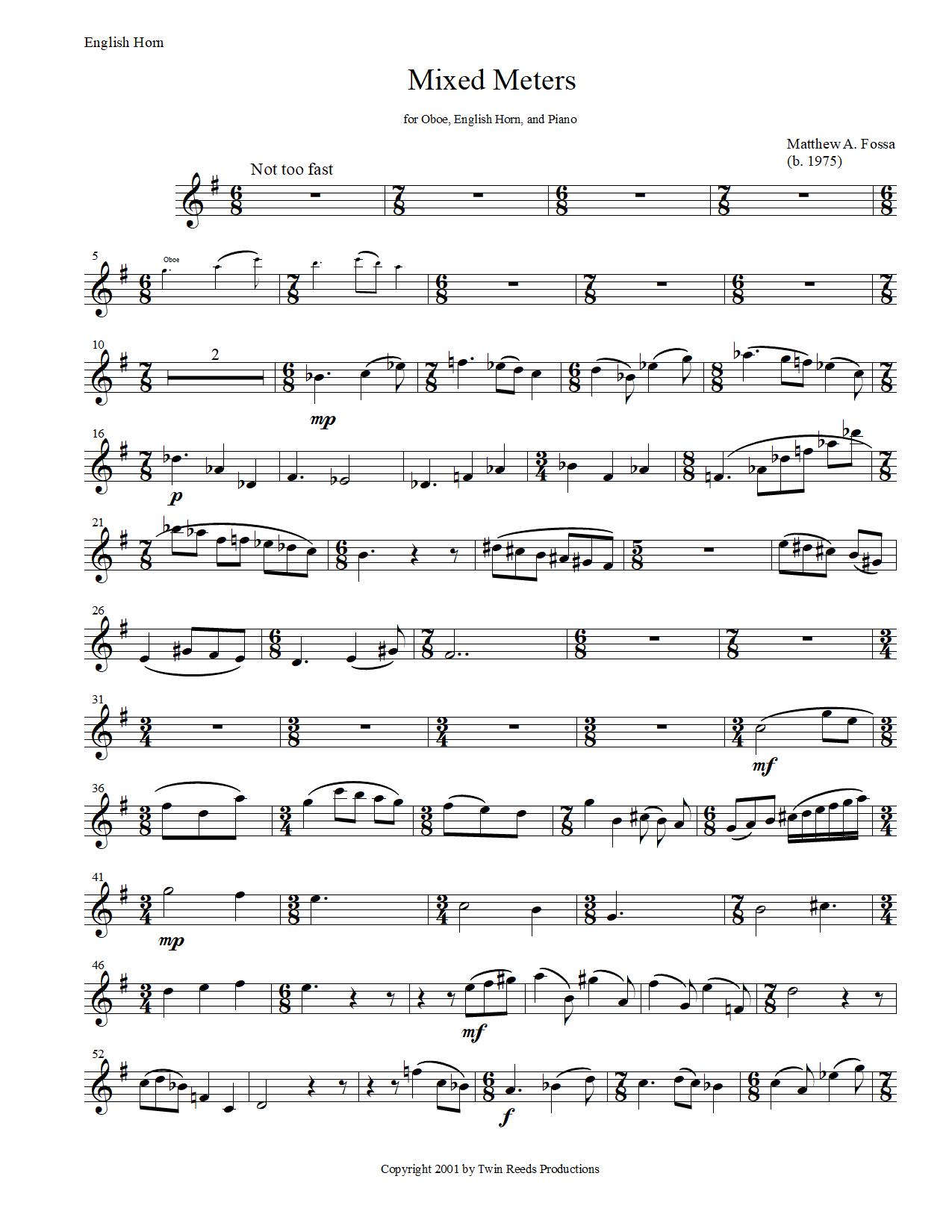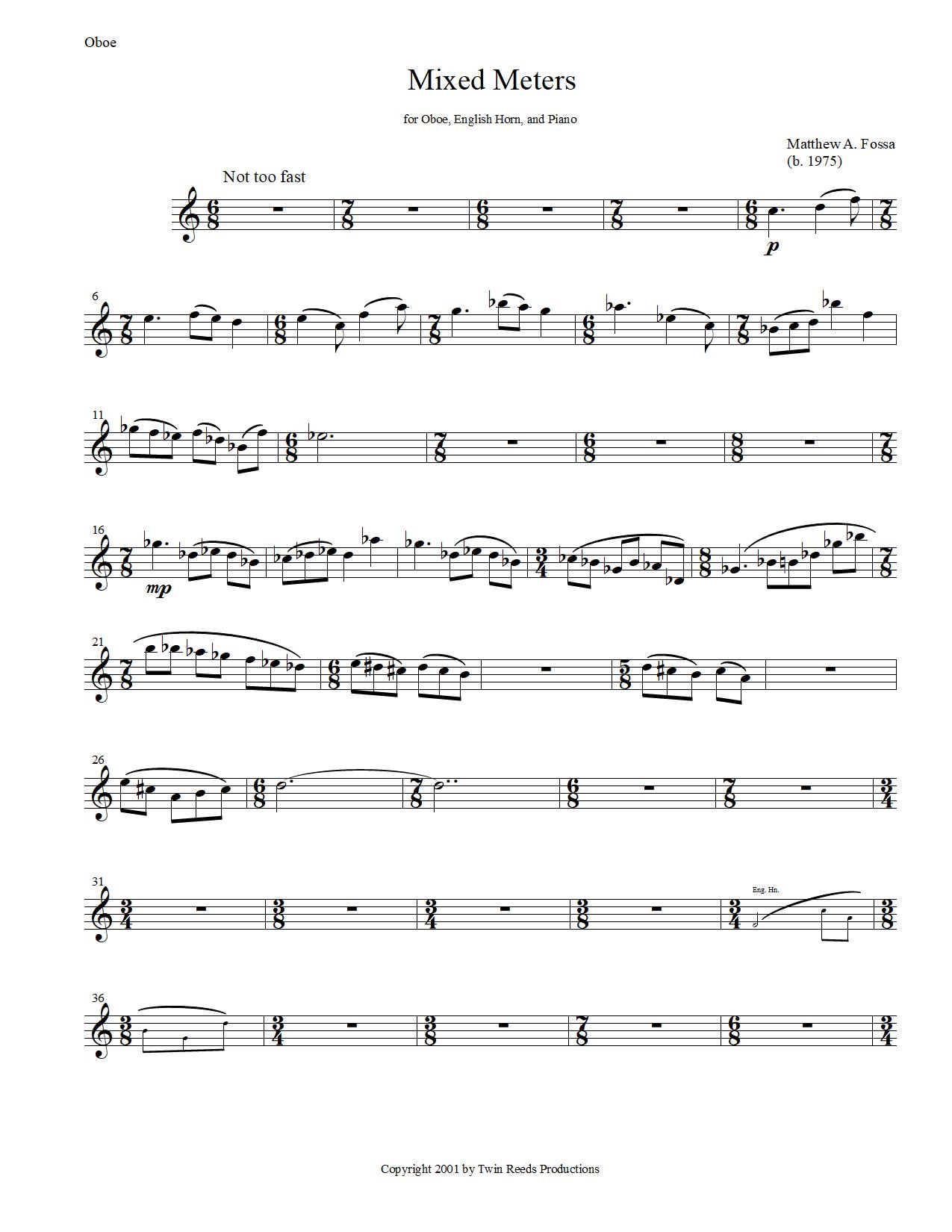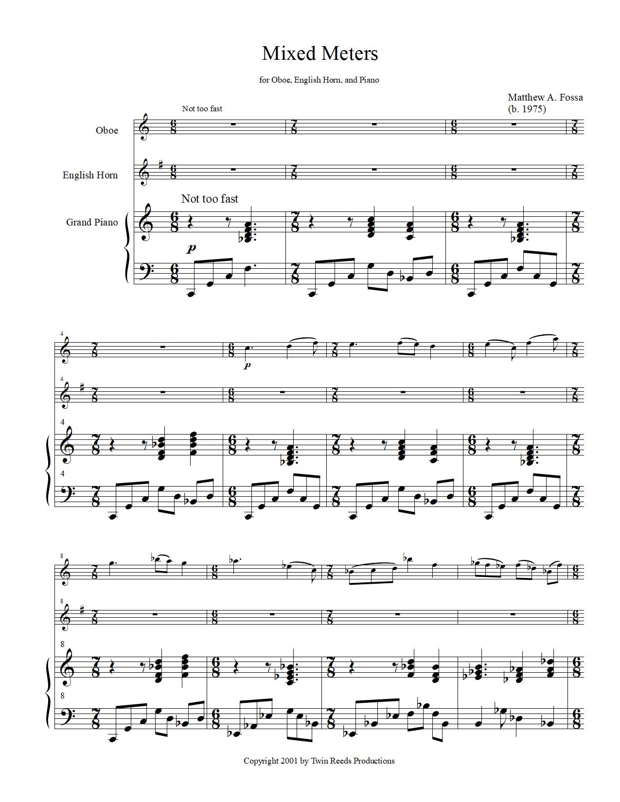 Mixed Meters was premiered in April of 1998 by my studio mate Kaylin Sanderl, myself, and Crane School adjunct professor Dr. Stephen Johnson, playing oboe, English horn, and piano respectively. It has since been performed in a variety of venues by a number of different musicians.